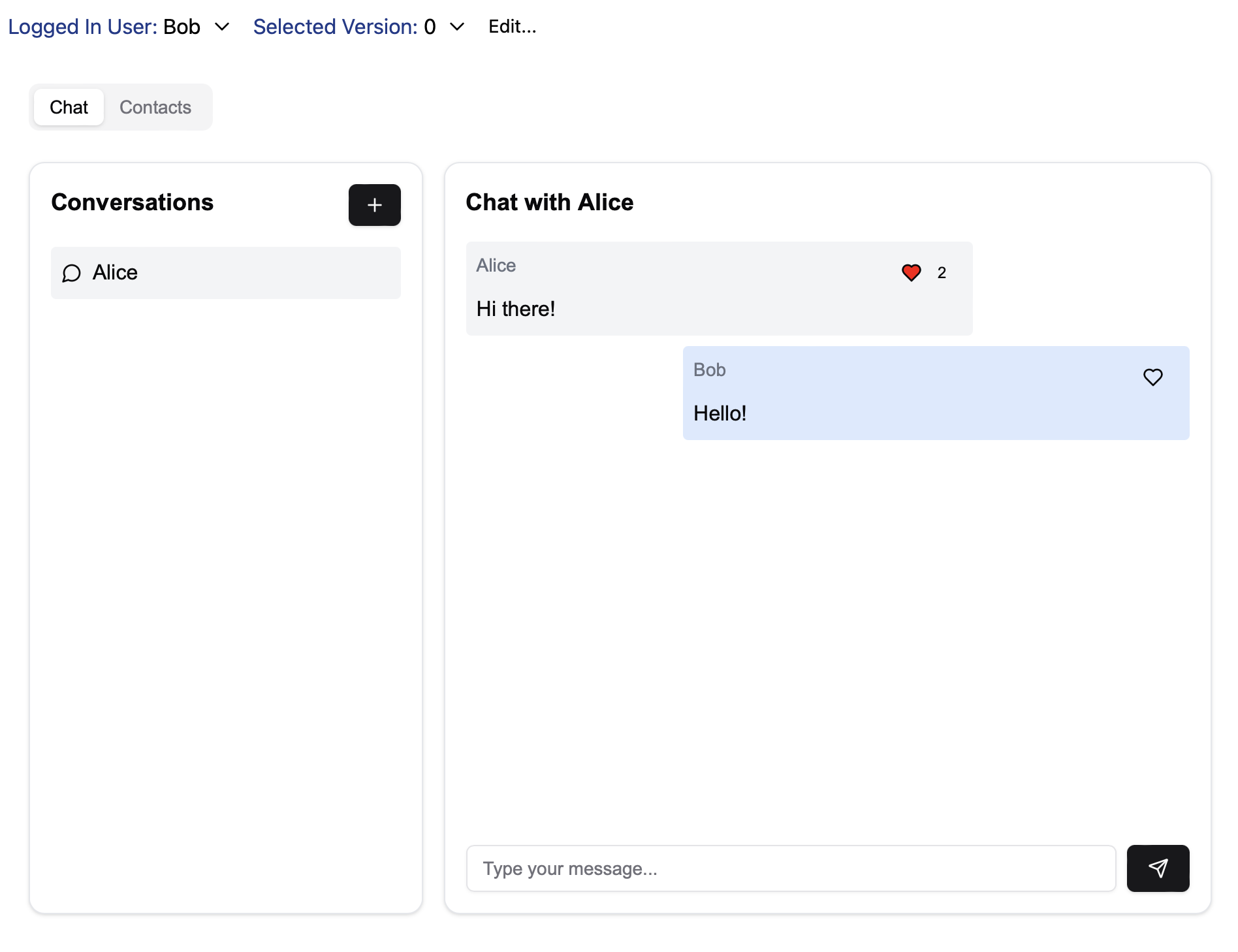 The overarching setup is to have a universal log-in handler which provides accounts that users can take with them to all applications. Here three users exist and you can just select which one is “logged-in” at a time to simulate different perspectives of the network: Alice, Bob, and Charlie.