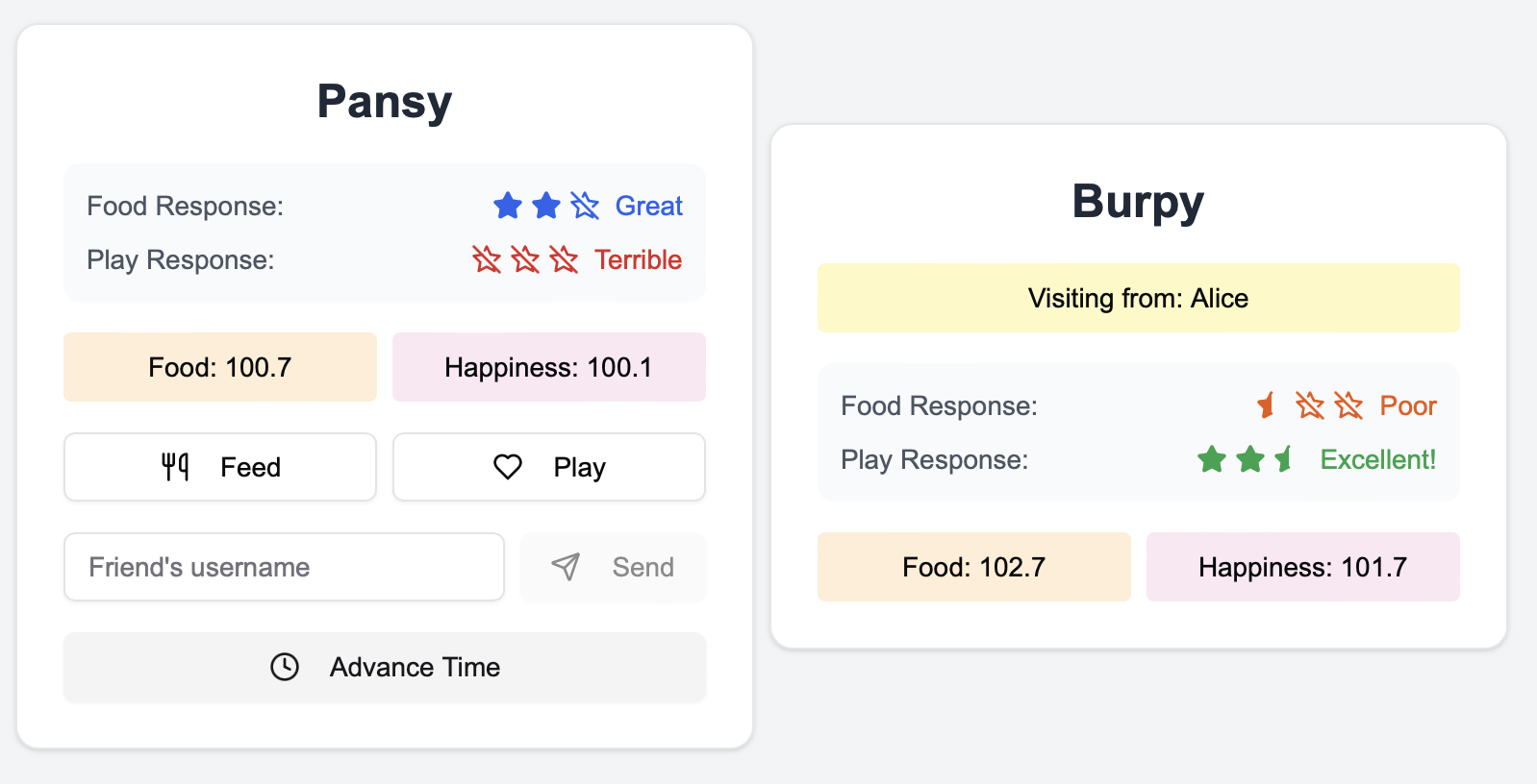 The derived state in general works by first figuring out how many ticks a pet has spent not at home. This is done by replaying the tick, moveAway, and moveHome events in their chronological order. How good the stats of the pet are can be computed fairly straightforwardly with this, which is done in currentdHunger and currentdHappiness. The actual food level and happiness level is then computed in currentHunger and currentHappiness. This requires some more event replaying shenanigans. It is also useful for the frontend to know at which user a pet currently is, so this state is also implemented. The odd name shows the need for some form of accompanying documentation, which can be shown to the chatbot which is generating the UI.